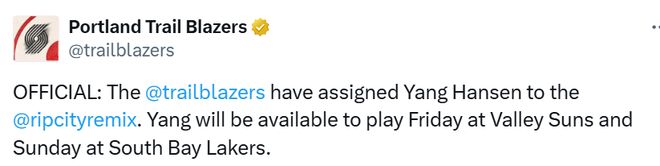 开拓者官宣下放杨瀚森:本周六迎发展联盟首秀 连续出战太阳湖人
