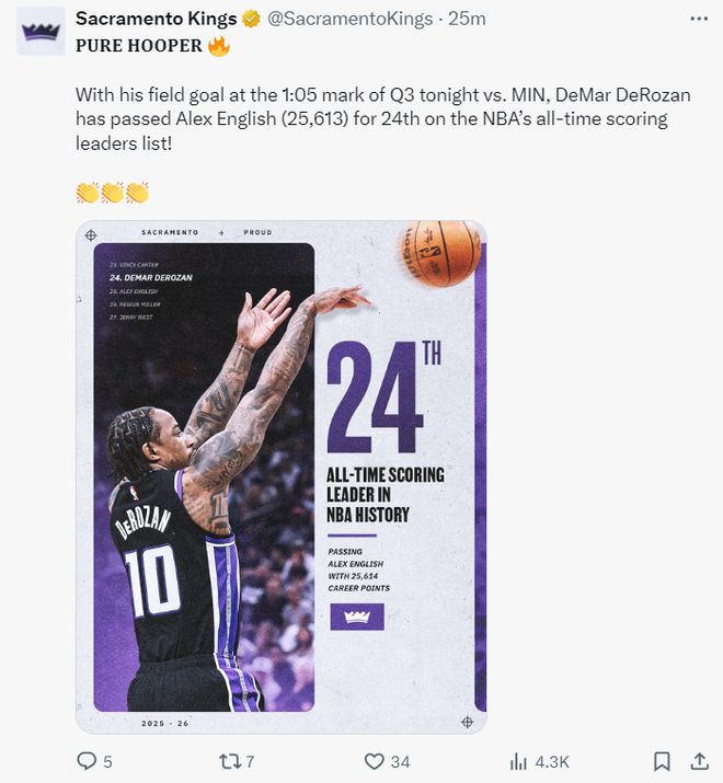 这场比赛还是德罗赞的里程碑之夜,他的总得分超过英格列什25613分升至NBA历史得分榜第24位。